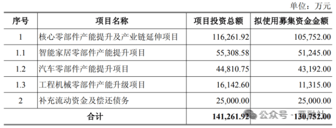 据领会,此轮募集资金拟用于焦点零部件产能提拔、财产链延长项目、弥补流动资金,将提拔智能家居、汽车零部件等高毛利营业产能,同时,引入从动化AI视觉检测设备提拔工艺及产质量量,有益于华翔进一步优化营业结构,加强公司的智能制制程度、提拔盈利能力。据华翔股份最新发布的募集平话审演讲显示,公司拟利用10。58亿元募集资金,用于焦点零部件产能提拔及财产链延长项目。该项目由智能家居零部件产能提拔项目、汽车零部件产能提拔项目、工程机械零部件产能升级项目形成。别的,华翔股份还拟利用2。5亿募集资金弥补流动资金及债权。